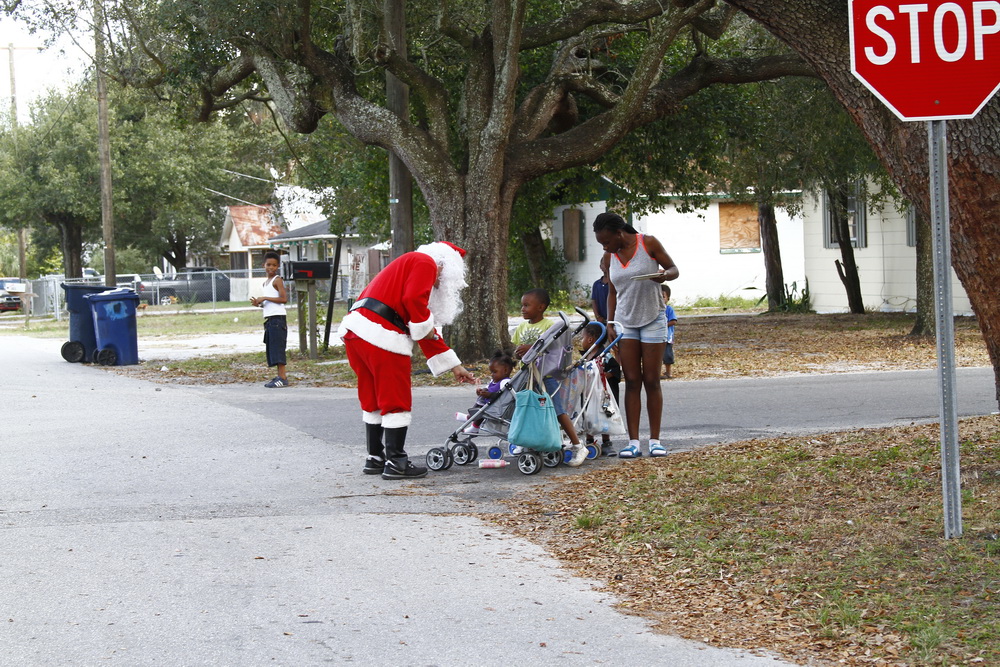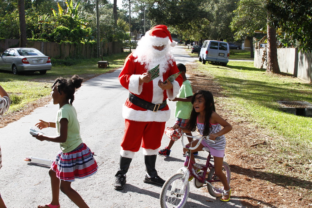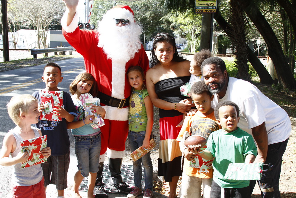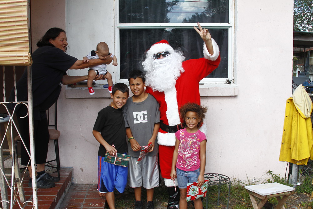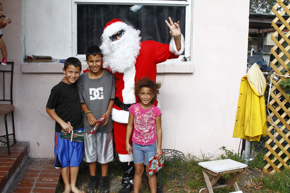 About 4 years ago we decided to buy some toys on clearance, wrap them and drive around the old neighborhood and pass them out. After two years of doing that I decided to put on a Santa costume and drive around handing out toys, then Santana Claus was born!