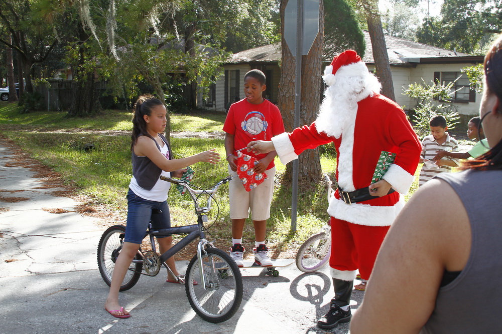 Basically we gather money from family and friends throughout the year and buy small toys for children. I then dress up as Santana Claus and load up the family and boxes of toys and drive around neighborhoods where kids live who could use a little Christmas spirit and fun.